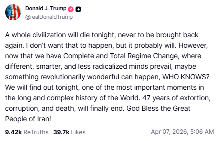特朗普周二上午在Truth Social上写道:“今晚将会有整个文明消亡,而且永远无法重建。我不希望这种事发生,但它很可能会发生。”