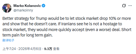科拉诺维奇在社交平台X上发文称:“对特朗普来说,更好的策略或许是让股市下跌10%甚至更多,并且表现出他根本不在乎。如果伊朗人看到他不是股市的人质,他们会更快接受协议——即便那是一份更糟糕的协议。短期痛苦,换取长期收益。”