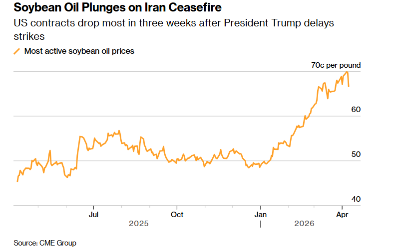 FX168财经报社(亚太)讯 受美国与伊朗达成临时停火协议影响,原油价格大跌,削弱了以农作物为原料的生物燃料吸引力,豆油期货重挫5%。