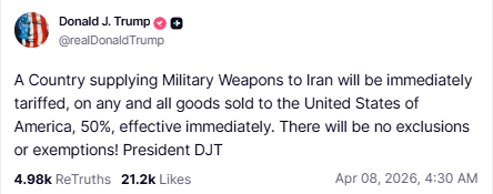 特朗普在Truth Social上发文写道:“任何向伊朗供应军事武器的国家,其向美利坚合众国出售的任何及所有商品,都将被立即征收50%关税,立刻生效。不设任何排除或豁免!”