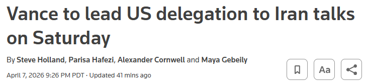 美伊谈判即将开启,美国副总统领衔代表团白宫周三(4月8日)表示,美国总统特朗普已派出由副总统万斯(JD Vance)、总统特使威特科夫和女婿库什纳领衔的谈判团队前往巴基斯坦首都伊斯兰堡,与伊朗展开新一轮谈判。首轮会谈预计将于周六举行。