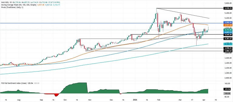 周三亚市盘中,美伊同意停火两周之后,美元和油价应声下跌,缓解了通胀升温和升息的疑虑,金价一度飙升至4857.65美元/盎司,为3月19日以来高点,日内涨幅达到152美元。