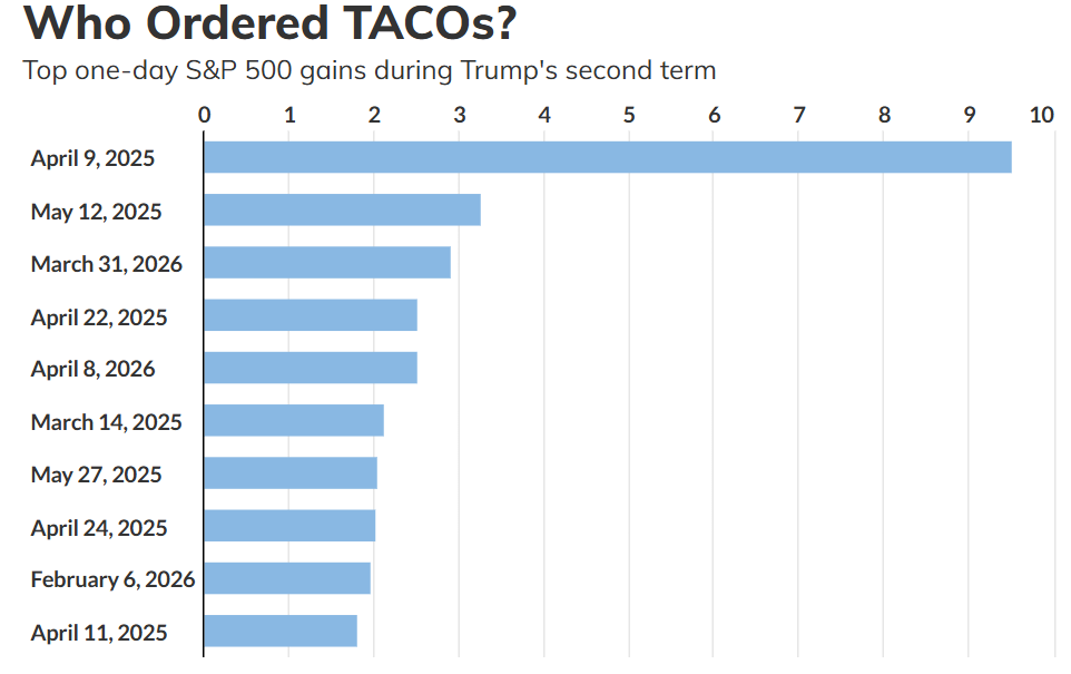 过去一年里,华尔街人口中的“TACO交易”已经从一个带有调侃意味的缩写——最早由《金融时报》一位专栏作家带火——演变成了影响市场的重要力量。3月,在美国和以色列对伊朗发动攻击后,原油价格飙升,而华尔街很多人认为,市场对特朗普总统迅速“来一波TACO”的期待,帮助股市守住了底部。