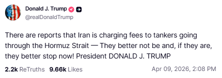 FX168财经报社(北美)讯 美国总统特朗普周四(4月9日)表示,如果伊朗正在向通过霍尔木兹海峡的油轮收取费用,那么伊方“最好现在就停止”。