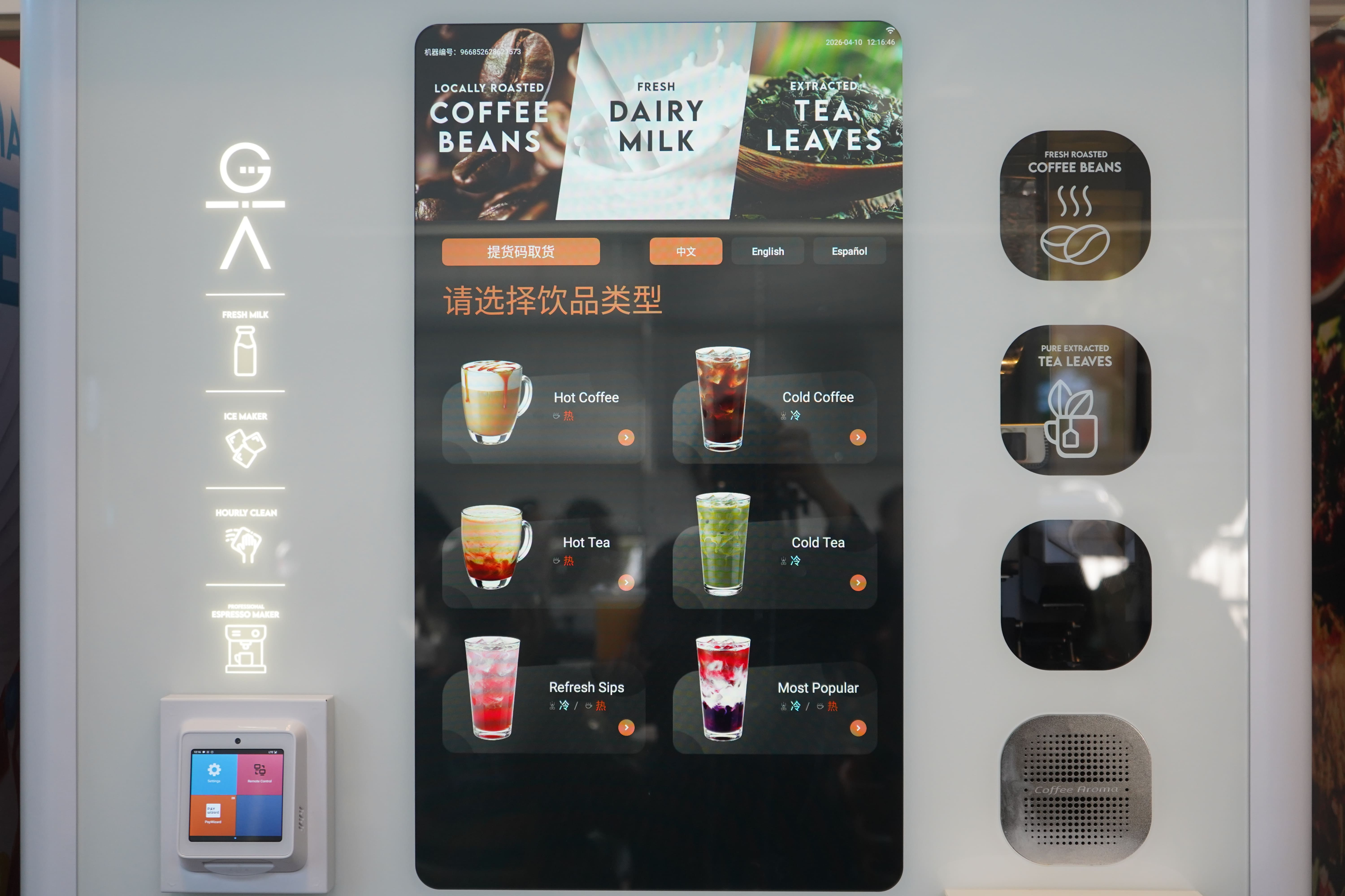 其中,智能饮品机已成为其代表性产品之一。设备可提供60多种冷热饮选择,支持糖度、冰量个性化设置,采用现磨咖啡豆与鲜奶制作,约30秒即可出杯。智能盒饭机有几十种不同风味的热食,约2分钟可以出餐,已在高频消费场景中广泛应用。