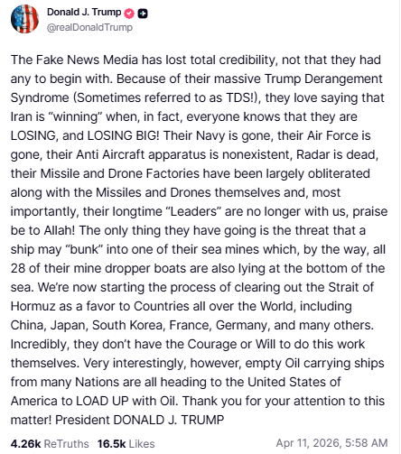 特朗普在Truth Social上写道:“我们现在正在开始清理霍尔木兹海峡的过程。”他还称,伊朗“全部28艘布雷艇都已经沉入海底”。