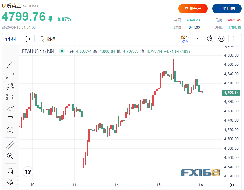 美市盘中,现货黄金延续跌势,现交投于4800美元/盎司略下方。