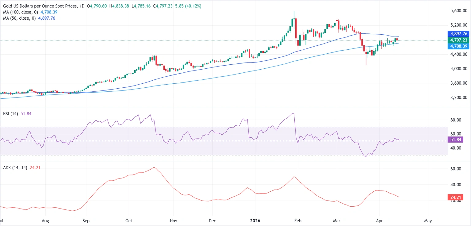 与此同时,100日均线位于4708美元附近,为当前价格提供初步支撑,也使整体走势维持在区间整理格局之中。