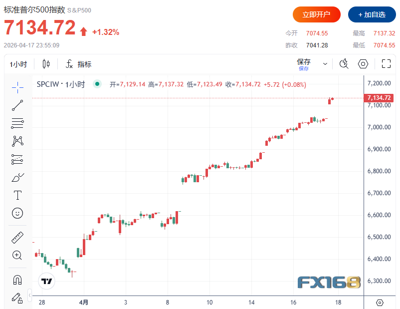 FX168财经报社(北美)讯 周五(4月17日),在伊朗宣布霍尔木兹海峡“全面开放”,且以色列与黎巴嫩停火消息持续发酵的背景下,美股强势拉升,三大股指全线大涨,市场风险偏好明显回暖。