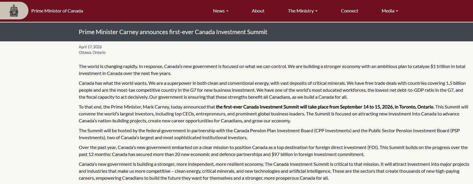在此背景下,加拿大总理马克·卡尼周五(4月17日)宣布,首届“加拿大投资峰会(Canada Investment Summit)”将于2026年9月14日至15日在安大略省多伦多举行。此次峰会将汇聚全球最大投资机构,以及顶级首席执行官、企业家和具有影响力的国际商业领袖。峰会将聚焦吸引新资金进入加拿大,推动国家级重大项目建设,为加拿大人创造新的职业机会,并带动经济增长。