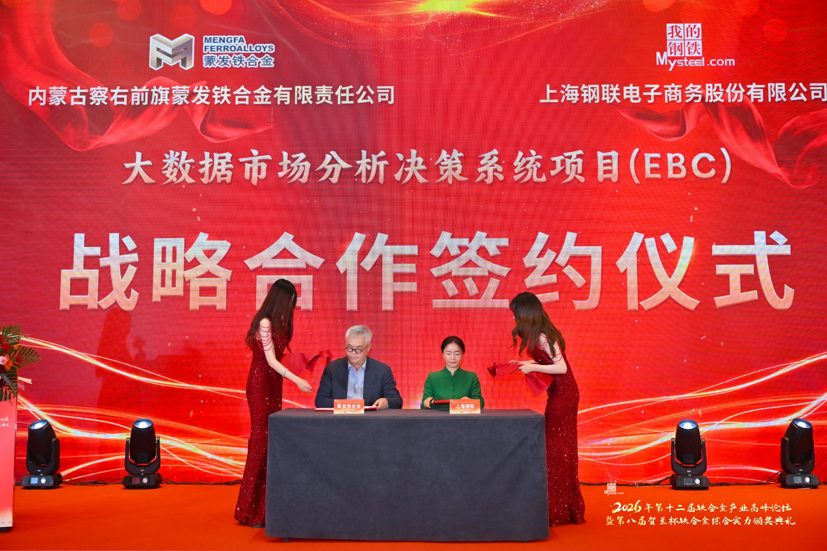 接着,大会进入签约环节,上海钢联EBC平台与蒙发铁合金正式达成合作,双方将共同探索合金领域数字化经营决策的全新应用场景。蒙发铁合金是国内铁合金行业数字化建设的标杆企业,拥有清晰的战略视野和扎实的落地能力。在此,我谨代表上海钢联,由衷感谢蒙发铁合金及邓国宏董事长的信任与选择,让我们共同探索智能市场分析领域的机遇。上海钢联一直以来都坚持用高质量的基础数据与数字科技,服务于产业分析及经营决策。本次合作融合了双方在各自领域的优势与积累,通过构建企业级数据底座,将内外部数据的融合,打造出具备“实时性 预测性 指导性” 的场景应用,助力企业实现从经验驱动到数据驱动、从人工运营到智能赋能的全面升级。这不仅是两家企业的携手,更是铁合金行业在数字化经营决策领域一次颇具意义的前沿实践。