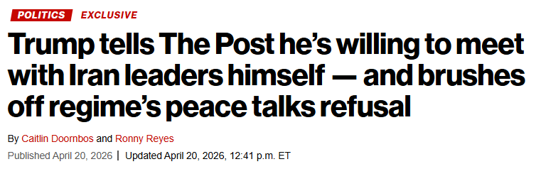 特朗普周一(4月20日)在接受《纽约邮报》采访时表示:“如果他们愿意见面,我没有任何问题。我们有非常有能力的团队,但我本人也愿意参与会谈。”这一表态显示出当前谈判的紧迫性,因停火协议预计将于本周三晚间到期。