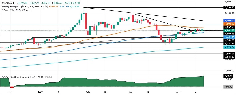 FXStreet分析师Christian Borjon Valencia指出,从价格走势来看,黄金有望继续横盘整理。相对强弱指数(RSI)显示,动能处于看涨区域,略微偏向买方,但强度不及预期。值得注意的是,上周五黄金价格触及4890美元/盎司的高点,而RSI却走低,出现轻微的负背离,这可能预示着金价将进一步回调。