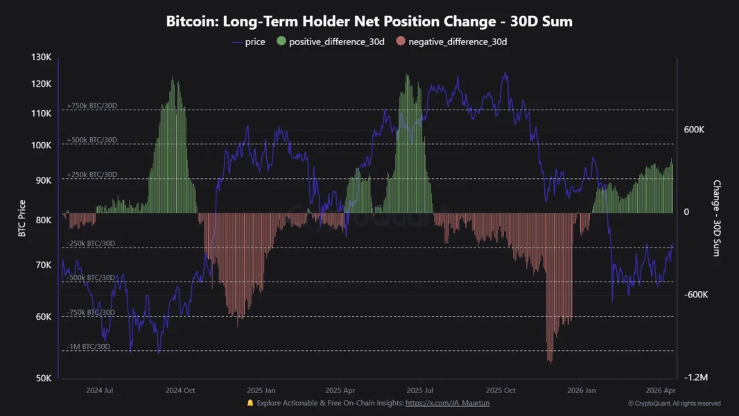 链上数据显示,这一筑底过程是伴随着长期持有者(LTH)供应量回升而展开的。所谓长期持有者,通常是指持币时间已超过155天的投资者。这一变化至少说明,随着比特币进入盘整阶段,市场中的长期持币信念正在增强。过去一个月中,约有34.5万枚比特币“成熟”为长期持有者持仓。