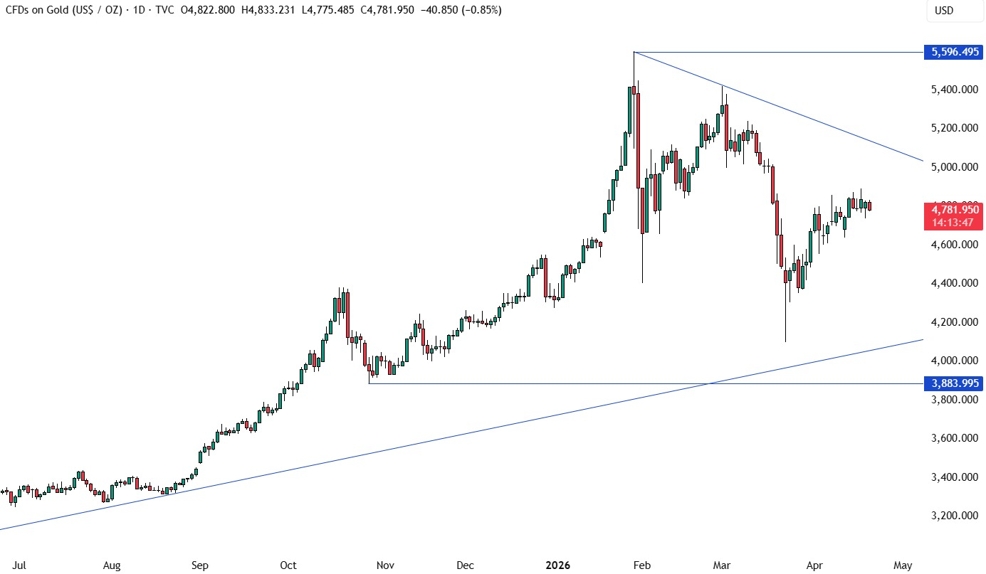 这导致市场在本周一重新开盘时出现向下跳空。尽管近期仍有一些积极进展,而且市场也预期美伊将于明日在伊斯兰堡举行会谈,但持续存在的不确定性,仍在压制黄金进一步上行空间。
