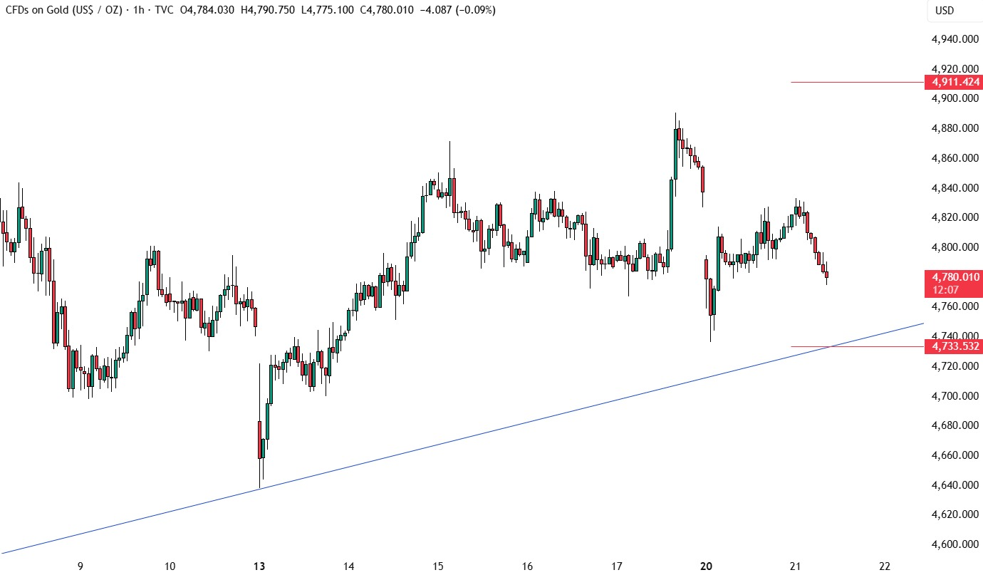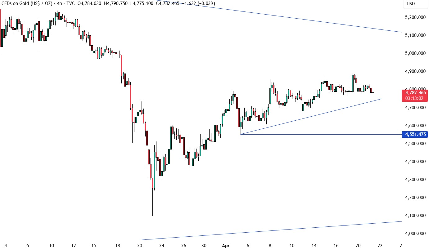 从4小时图来看,一条较小级别的上升趋势线目前正充当支撑位。买方大概率会依托这条趋势线继续布局,在跌破该线下方设定明确止损,推动金价进一步上探主要下行趋势线。而卖方则将关注该支撑线是否被跌破,一旦失守,金价接下来可能进一步回调至4550美元水平。