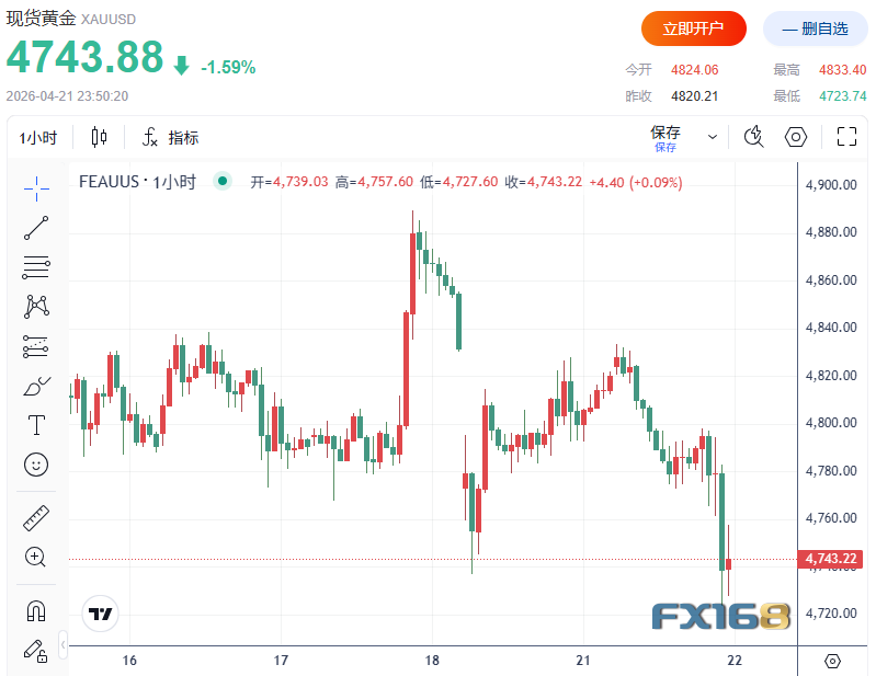 FX168财经报社(北美)讯 周二(4月21日),现货黄金走势偏弱,但整体缺乏明确而强劲的方向性动能。由于投资者仍在观望美伊和平谈判是否会恢复,在周末霍尔木兹海峡紧张局势再度升温之后,市场暂不愿展开激进押注。
