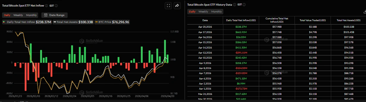 与此同时,机构资金继续流入比特币现货ETF。数据显示,现货比特币ETF周一录得约2.38亿美元净流入,而此前一周累计净流入接近10亿美元。如果这一趋势延续,可能继续为比特币带来上行动力。