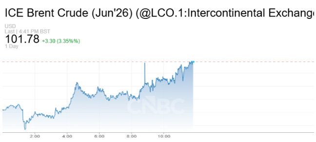 受地缘政治风险升温影响,国际油价周三走高,但盘中波动明显。6月交割的布伦特原油期货现上涨3.3%,报101.78美元/桶,此前一度突破100美元关口;6月交割的美国西得州中质原油(WTI)期货现上涨近3.6%,报92.88美元/桶。