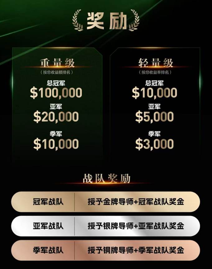 第二届「中国好交易」在首届丰厚奖励基础上,新增战队奖励,以高额现金与权威荣誉双重加持,让实力与回报高度匹配。