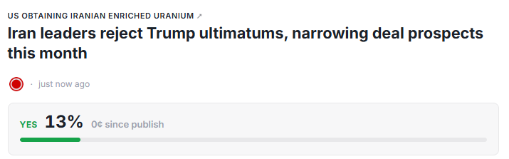 受此影响,围绕“美国是否将在5月31日前获得伊朗浓缩铀”的预测市场概率明显下滑,“是”的概率已降至12%,较此前水平下跌15个百分点,显示市场对外交突破的预期正在快速降温。