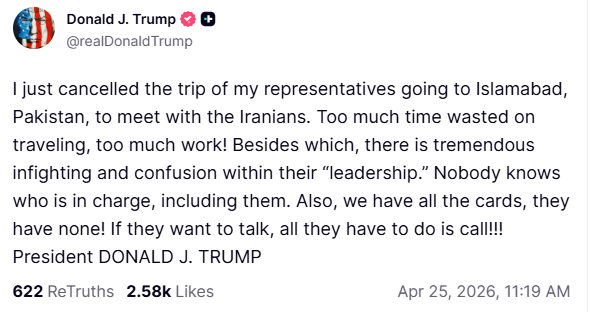 FX168财经报社(北美)讯 美国总统特朗普周六(4月25日)表示,他已取消派遣美国特使史蒂夫·威特科夫(Steve Witkoff)和其女婿贾里德·库什纳(Jared Kushner)前往巴基斯坦的计划。