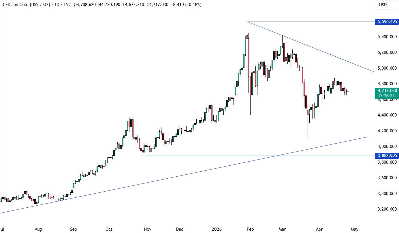在日线图上可以看到,在美伊僵局背景下,黄金继续盘整。买方的自然目标仍是位于5,000美元附近的下行趋势线。如果价格到达该位置,预计卖方将入场,并以趋势线上方作为明确风险界限,布局金价回落至4,200美元附近的主要上行趋势线。另一方面,买方则会关注金价能否突破该趋势线,从而推动涨势进一步延伸至5,400美元附近。
