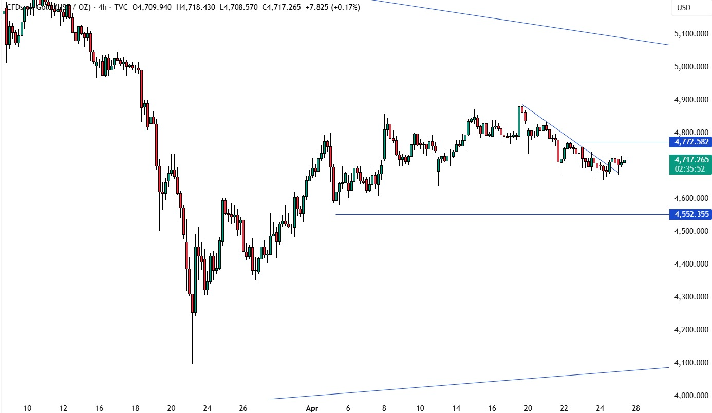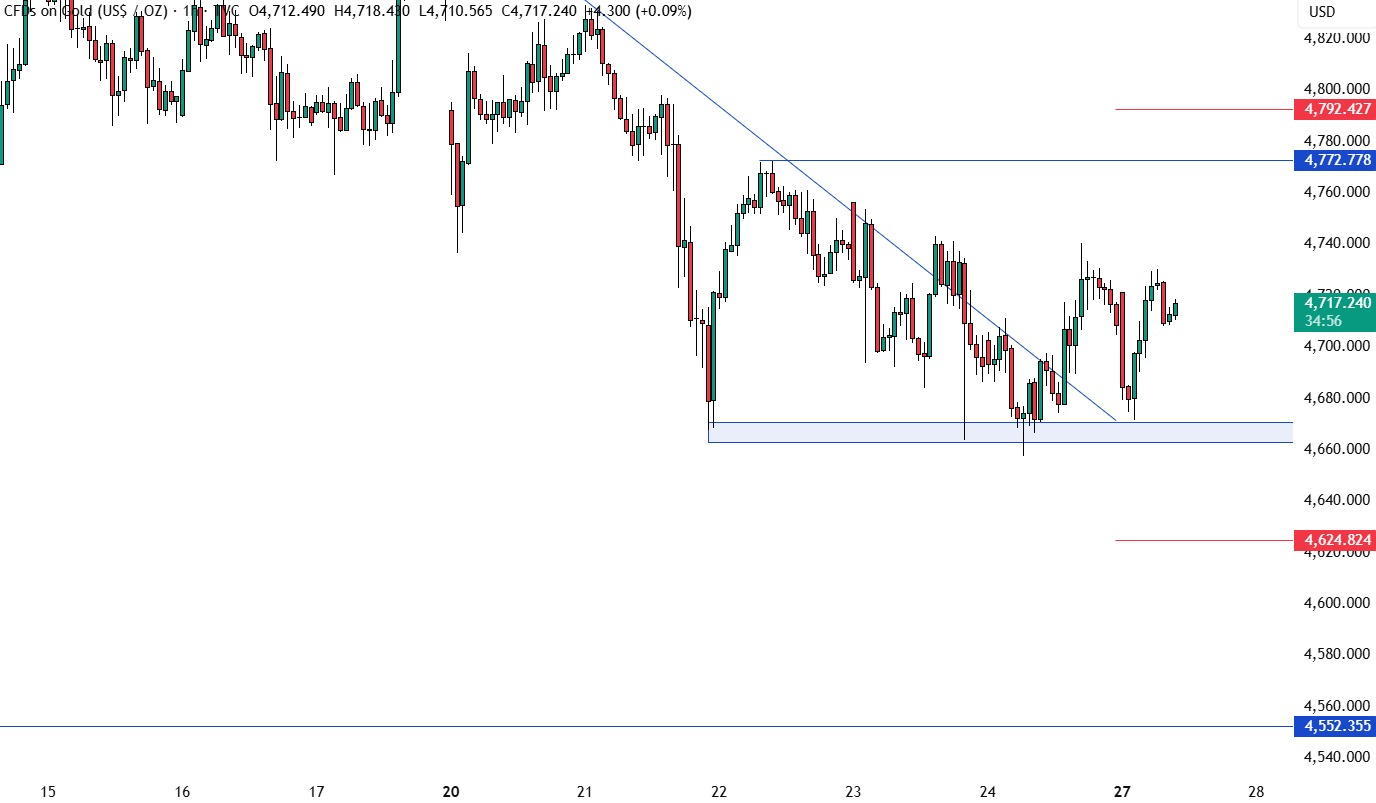 在4小时图上可以看到,价格已经突破此前界定回调走势的小型下行趋势线。4,772美元的摆动高点目前可能转为阻力位。卖方可能会在该位置附近入场,并以阻力位上方作为明确风险界限,继续推动价格下探4,552美元。另一方面,买方则会关注金价能否突破该阻力位,以增加看涨押注,并进一步上看5,000美元。