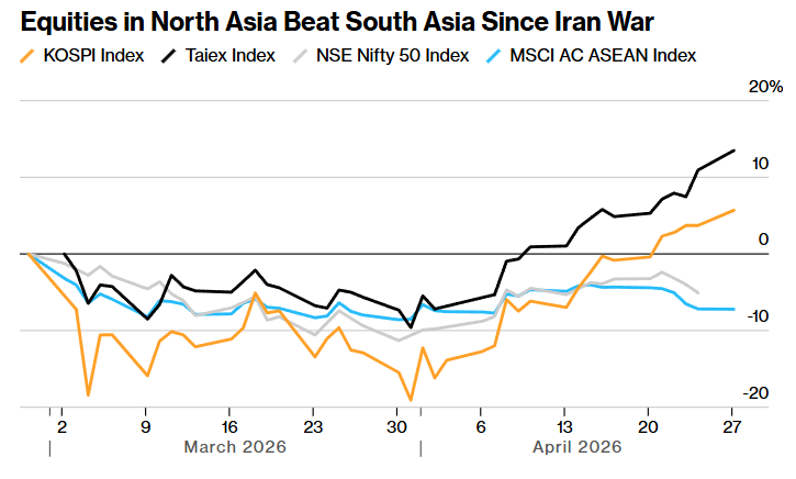 不过,风险仍然存在。尽管标普500指数已刷新历史高位,MSCI亚洲基准指数尚未完全收复伊朗冲突以来的跌幅。投资者也对亚洲市场对超大规模云服务商的依赖保持警惕,这意味着本轮上涨对美国科技巨头财报仍高度敏感,包括Alphabet、亚马逊、Meta Platforms和微软等公司的业绩。