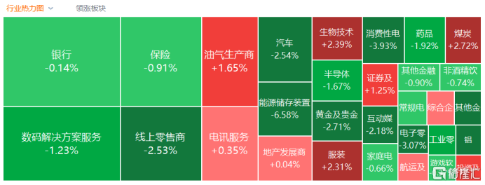 盘面上,作为市场风向标的大型科技股集体低迷大市承压明显,小米尾盘跌近4%;锂电池股下挫,宁德时代大跌近7%;苹果概念股集体弱势,瑞声科技领跌;AI应用龙头尽数下跌,航空股、汽车股、餐饮股、半导体股纷纷下挫。另一方面,药明康德逆势大涨13.57%表现尤其抢眼,带领生物医药股齐涨;煤炭股全天活跃,中煤能源劲升超7%;中资券商股、石油股、重型机械股多数上涨。