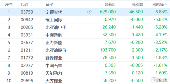 锂电池股下跌,宁德时代跌超6%,理士国际、比亚迪电子、中创新航等多股跟跌。