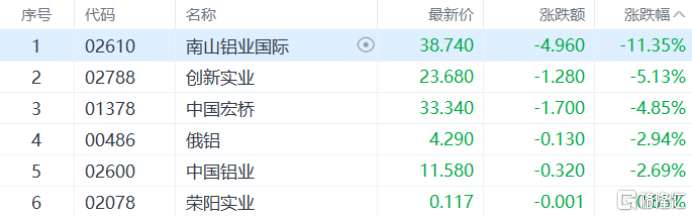 铝业股走弱,南山铝业国际跌超11%,创新实业、中国宏桥等多股跟跌。
