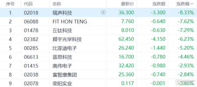 苹果概念股下挫,瑞声科技跌超8%,丘钛科技、蓝思科技等多股跟跌。