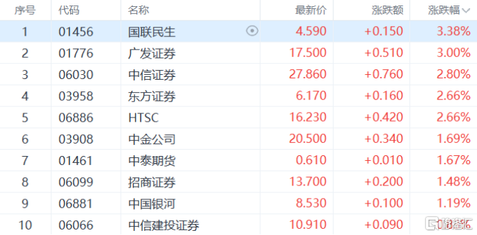 中资券商股强势,国联民生涨超3%,广发证券、中信证券涨幅居前。