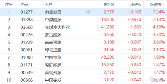 煤炭股上涨,力量发展、中煤能源涨超7%,蒙古能源、中国神华等多股跟涨。