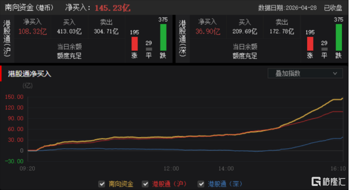 今日,南向资金净买入145.23亿港元,其中港股通(沪)净买入108.32亿港元,港股通(深)净买入36.9亿港元。